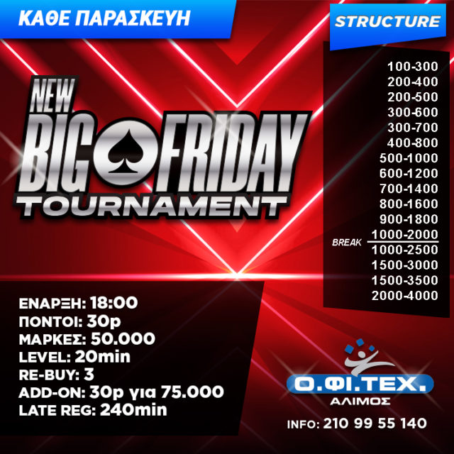 H oλοκλήρωση της Go for Gold Series φέρνει και πάλι τη δράση στους κανονικούς ρυθμούς σε όλες τις αίθουσες. Γεμάτο το πρόγραμμα της Παρασκευής με Big Friday, Texas Masters και Freeroll/Midnight Wolves σε Άλιμο, Περιστέρι και Πειραιά αντίστοιχα.