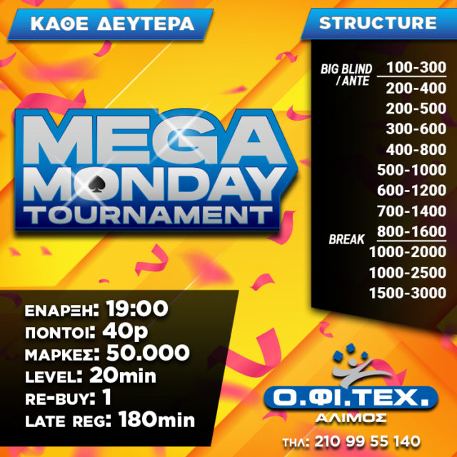 Νέα εβδομάδα δράσης στις αίθουσες Ο.ΦΙ.ΤΕΧ. και η Δευτέρα θα “τρέξει” με Mega Monday στον Άλιμο, Texas Hold’em στο Περιστέρι και freeroll στον Πειραιά.