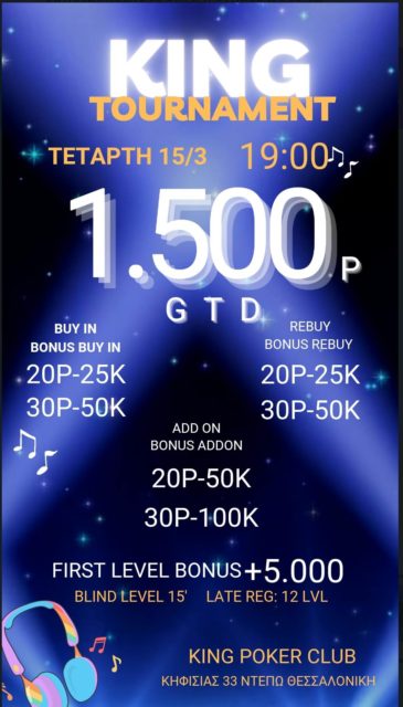 Σήμερα στις 19:00 θα λάβει χώρα ένα μίνι τουρνουά με 1.500p gtd, ενώ από νωρίς το απόγευμα ως το πρωί αναμένονται ομηρικές μάχες στα Texas & PLO ring tables του συλλόγου!