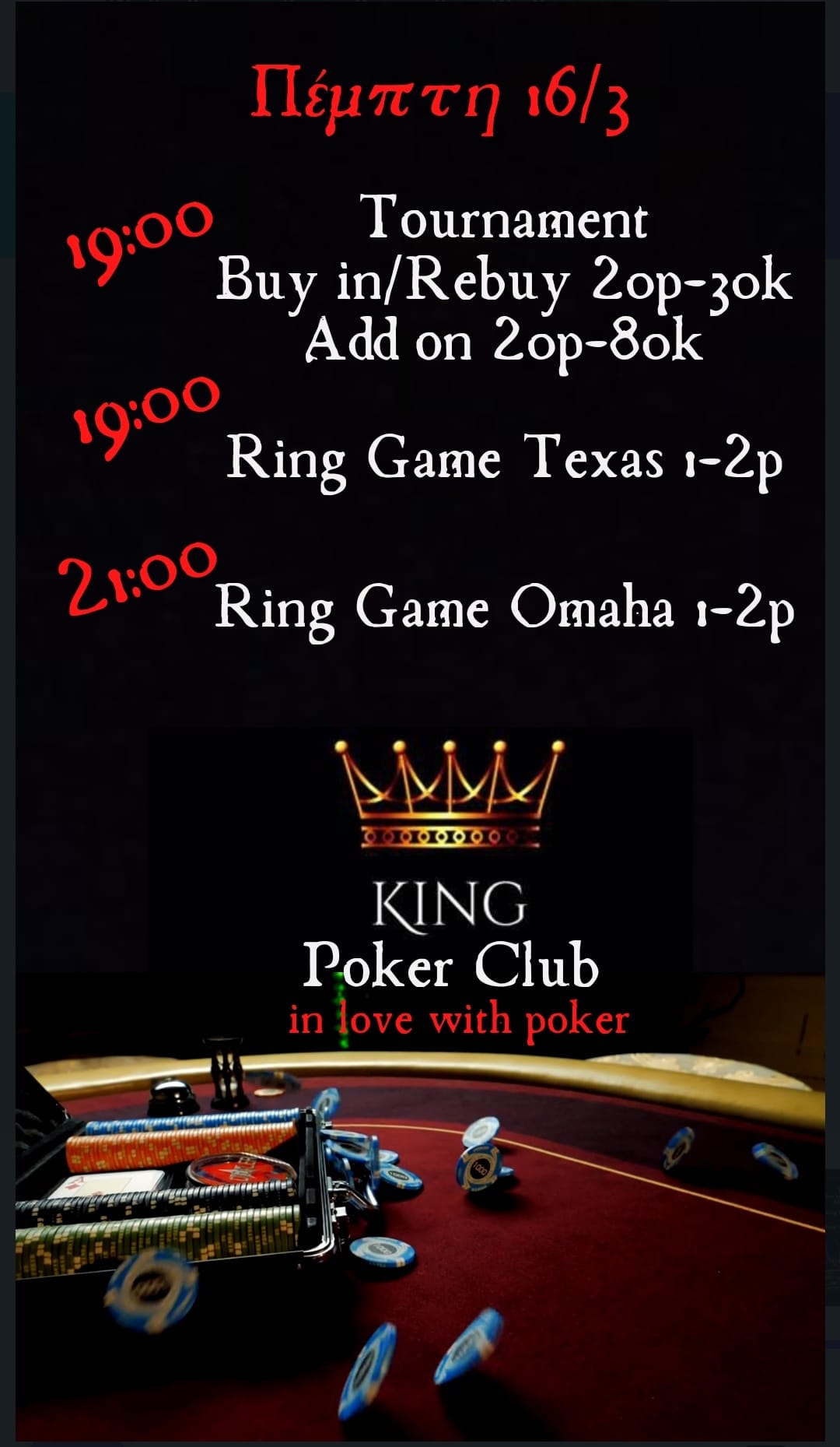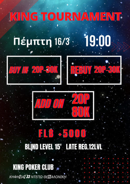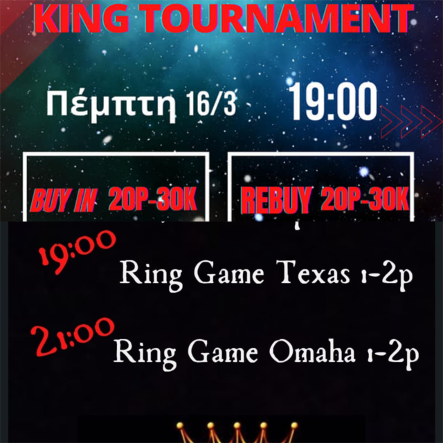 Mε 27 παίκτες, 1.608p στο prize pool και νικητή τον Wizard ολοκληρώθηκε το χθεσινό τουρνουά του King και σειρά παίρνει σήμερα ένα 20p R/A NLHE στις 19:00.