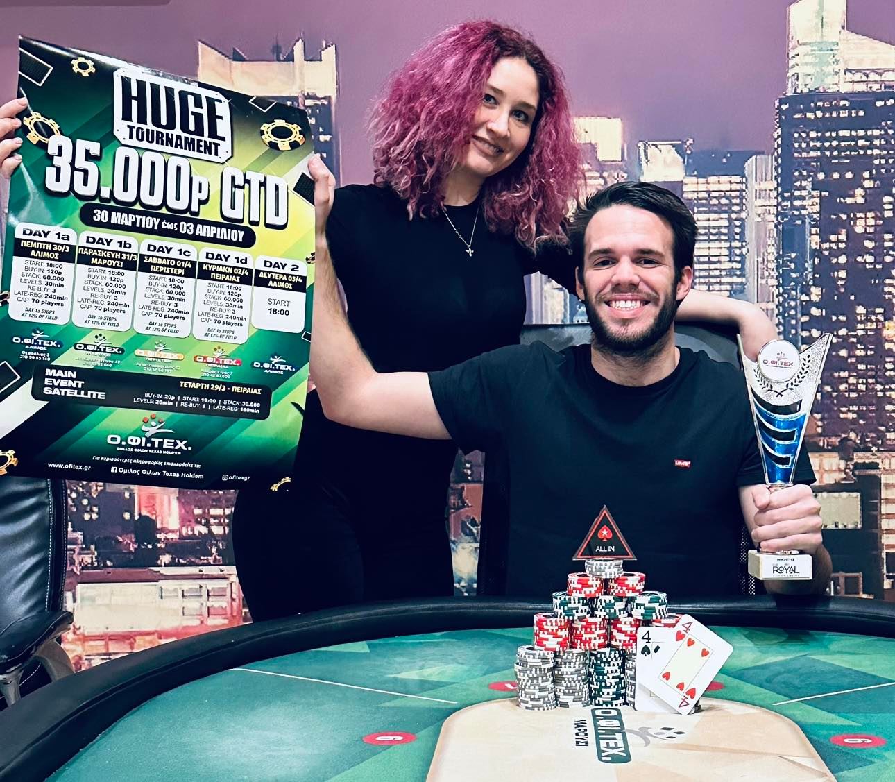 Ο Αlan Prigent ήταν ο μεγάλος νικητής του σαββατιάτικου Royal που κέρδισε 2.150p και βρέθηκε στην αναμνηστική φωτογραφία με το τρόπαιο στο ένα χέρι και την αφίσα του επερχόμενου Huge Tournament (35.000p gtd) στο άλλο! Σήμερα σας περιμένει το καθιερωμένο πρόγραμμα της Κυριακής με Challenge στο Περιστέρι, freeroll/Big Port στον Πειραιά και WarZone στην Κρήτη.