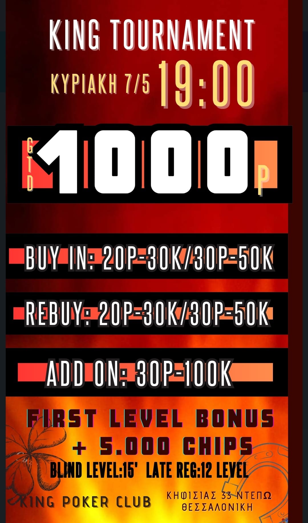 Δικαίωμα για καθυστερημένες εγγραφές και απεριόριστα rebuys (20p – 30.000 μάρκες) στα πρώτα 12 levels