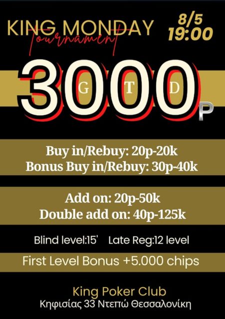 Τη σκυτάλη παίρνει σήμερα το κορυφαίο εβδομαδιαίο τουρνουά (King Monday) που επιστρέφει στις 19:00 με 3.000p gtd!