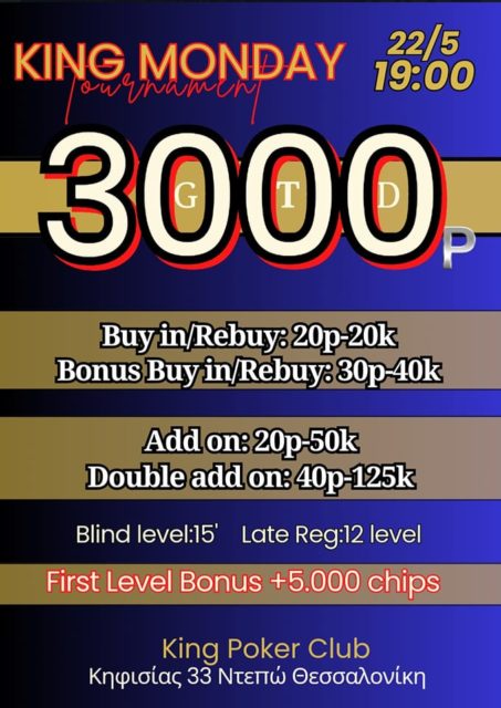 Σειρά παίρνει σήμερα το κορυφαίο εβδομαδιαίο τουρνουά (King Monday) που επιστρέφει στις 19:00 με 3.000p gtd!