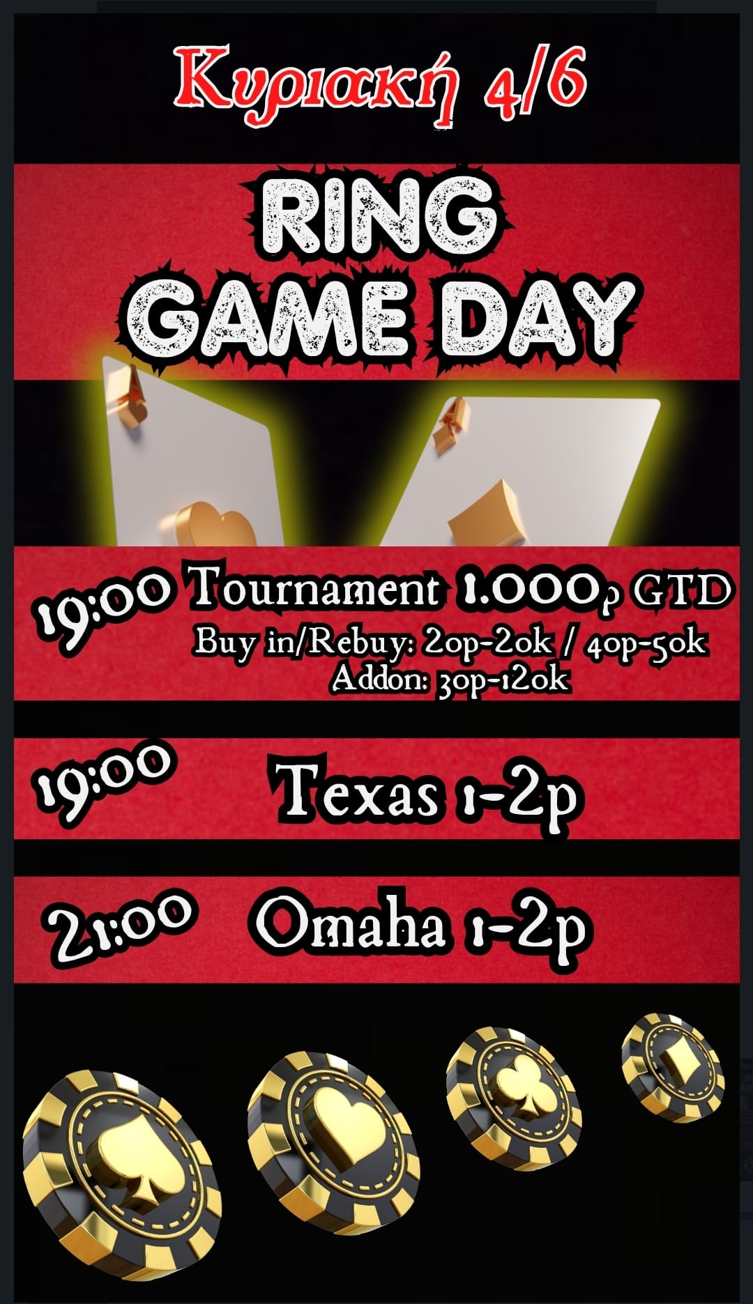 Σήμερα στις 19:00 θα λάβει χώρα ένα 20p R/A NLHE με 1.000p gtd και bonus first level 5.000 μάρκες, ενώ από τις 19:00 ανοίγουν τα Texas games και από τις 21:00 τα PLO games!