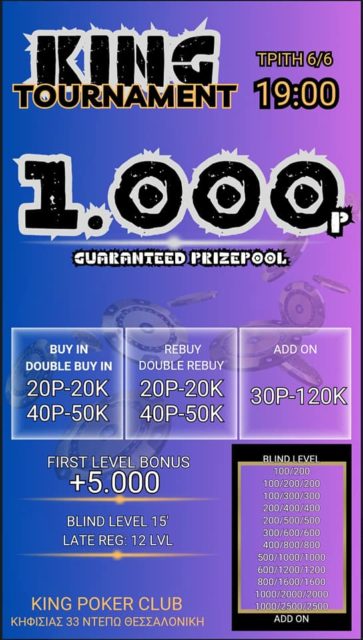 Σήμερα στις 19:00 θα λάβει χώρα ένα 20p R/A NLHE με 1.000p gtd και bonus first level 5.000 μάρκες, ενώ οι λάτρεις των ring games θα βρουν Texas και PLO games από νωρίς το απόγευμα!