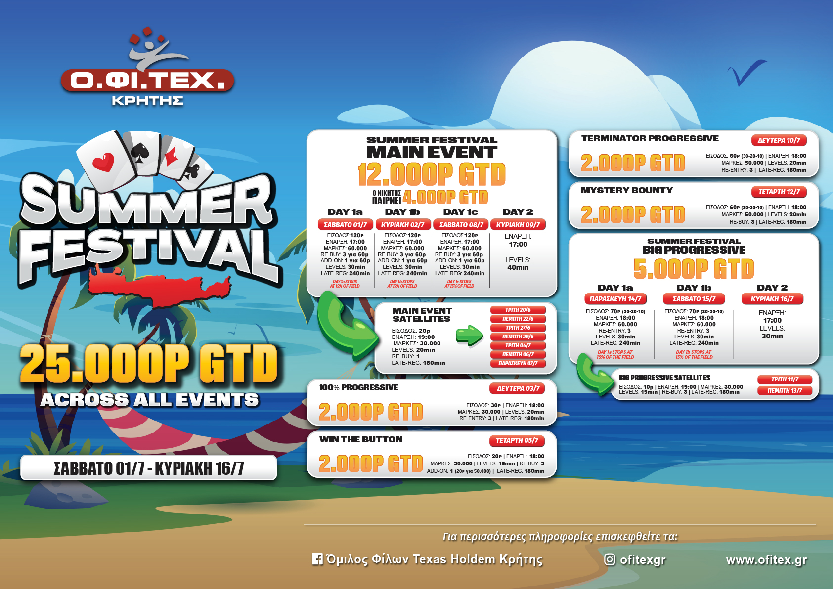 Σήμερα σας περιμένουν Mega Monday και Tournament Masters με 3.000p gtd και 2.000p gtd αντίστοιχα, ενώ η Κρήτη ετοιμάζεται για το δικό της καλοκαιρινό φεστιβάλ με 25.000p gtd και από αύριο η αίθουσα θα φιλοξενεί satellites για το 120p main even!