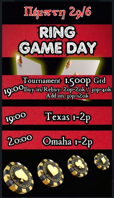 Σήμερα στις 19:00 θα λάβει χώρα ένα 20p R/A NLHE με 1.500p gtd, ενώ τα ring games “τρέχουν” ΚΑΘΕ ΜΕΡΑ με τραπέζια τόσο Texas όσο και PLO!