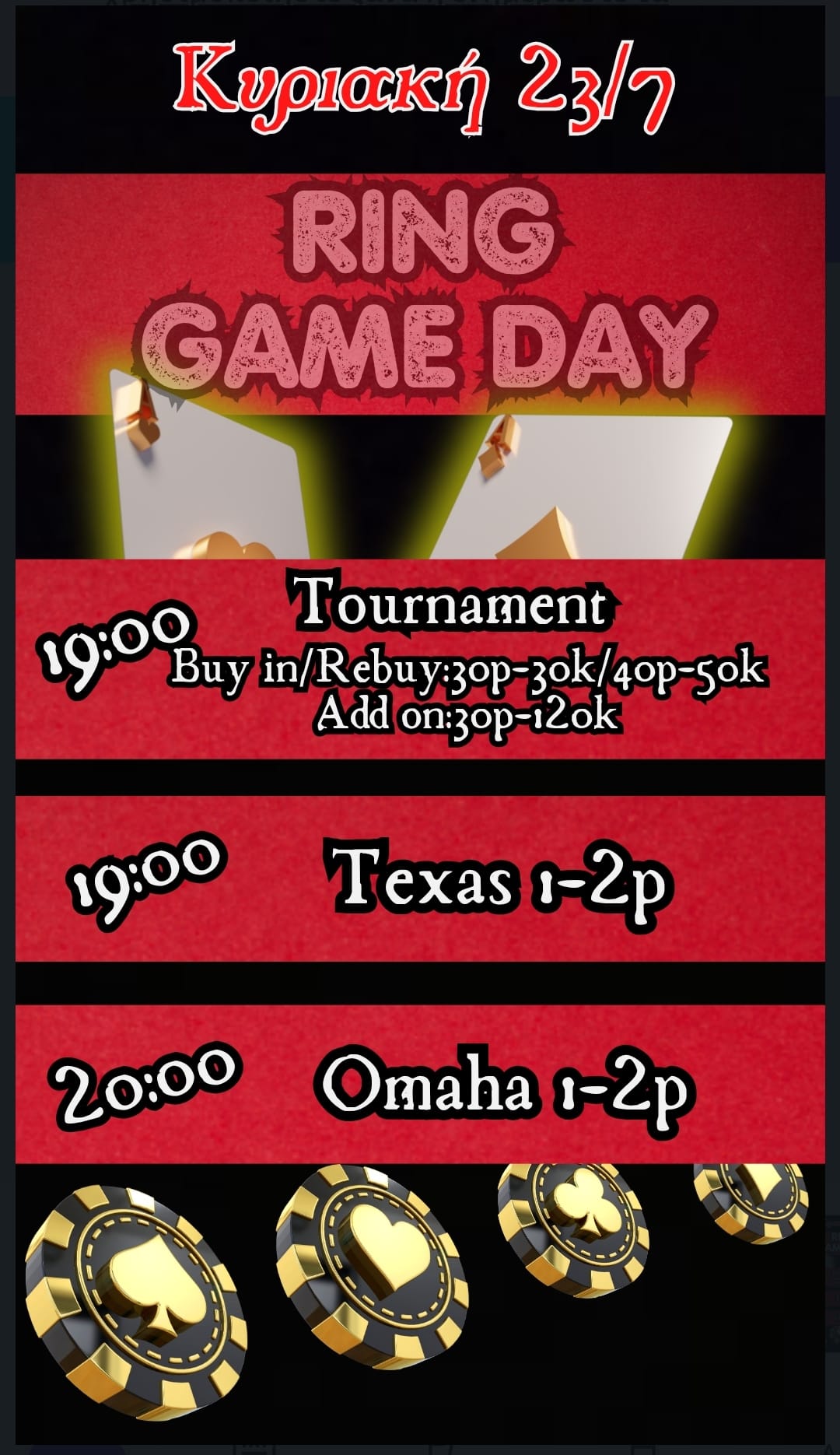 Η δράση συνεχίζεται κανονικά και σήμερα και περιλαμβάνει τόσο μίνι τουρνουά όσο και τα ασταμάτητα Texas & PLO ring games που “τρέχουν” ανελλιπώς!