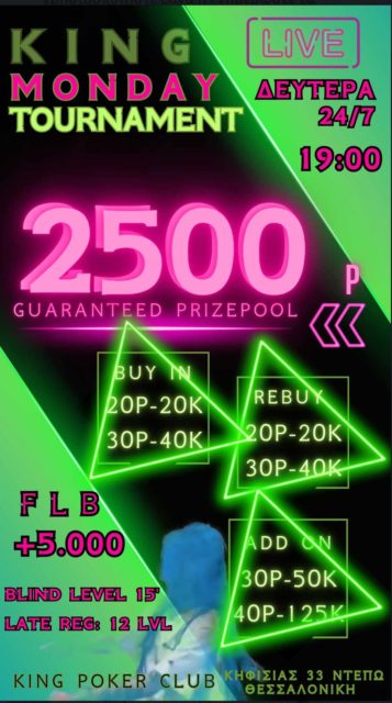 Το καθιερωμένο King Monday επιστρέφει σήμερα στις 19:00 με 2.500p gtd, ενώ την προηγούμενη εβδομάδα μοίρασε 4.000p+!
