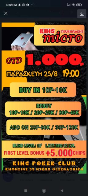 M” ένα 10p Micro που συνοδεύεται από 1.000p gtd συνεχίζεται απόψε η δράση, ενώ στην ανακαινισμένη αίθουσα του συλλόγου θα “τρέχουν” από νωρίς Texas και PLO games!