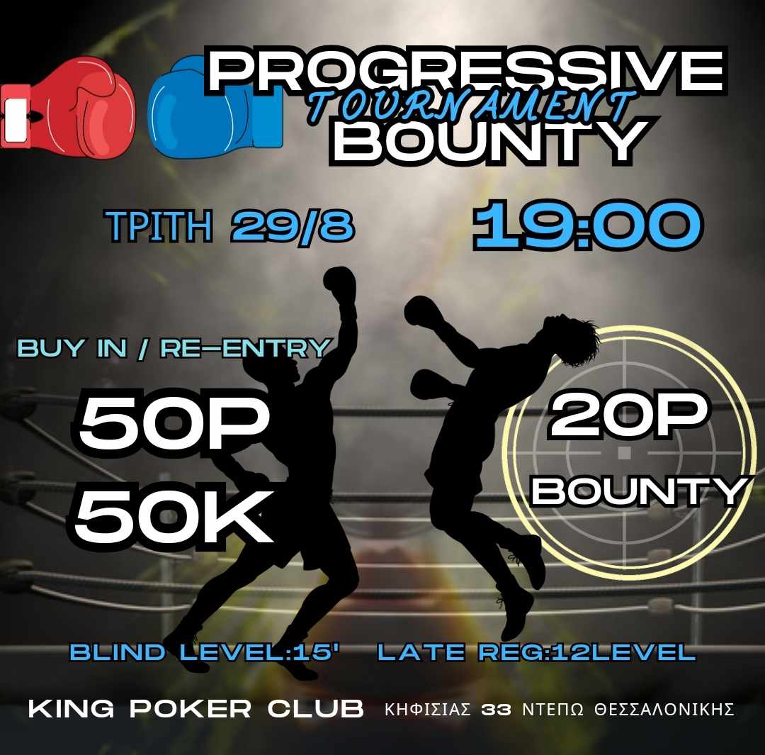 Σήμερα στις 19:00 πρόκειται να λάβει χώρα ένα 50p NLHE Progressive Bounty. Αυτό σημαίνει πως με κάθε αποκλεισμό, από τα 20p του bounty εξασφαλίζετε άμεσα 10p και οι υπόλοιποι 10p μπαίνουν στο “κεφάλι” σας.