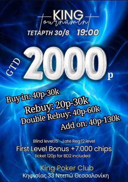 Μ” ένα κλασικό Texas Hold’em τουρνουά με είσοδο 40p και 2.000p gtd συνεχίζεται απόψε η δράση στο King.