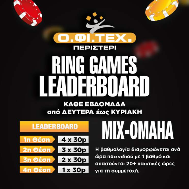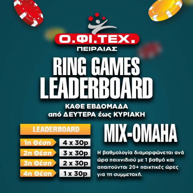 Καθημερινά σε όλες τις αίθουσες ‘τρέχουν‘ ring games από τα μικρότερα δυνατά stakes για τους λάτρεις του είδους!