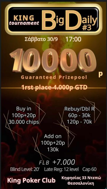 Το επόμενο Σάββατο εξάλλου έρχεται το Big Daily #3, αυτή τη φορά με 10.000p gtd και το νικητή να κερδίζει τουλάχιστον 4.000p!
