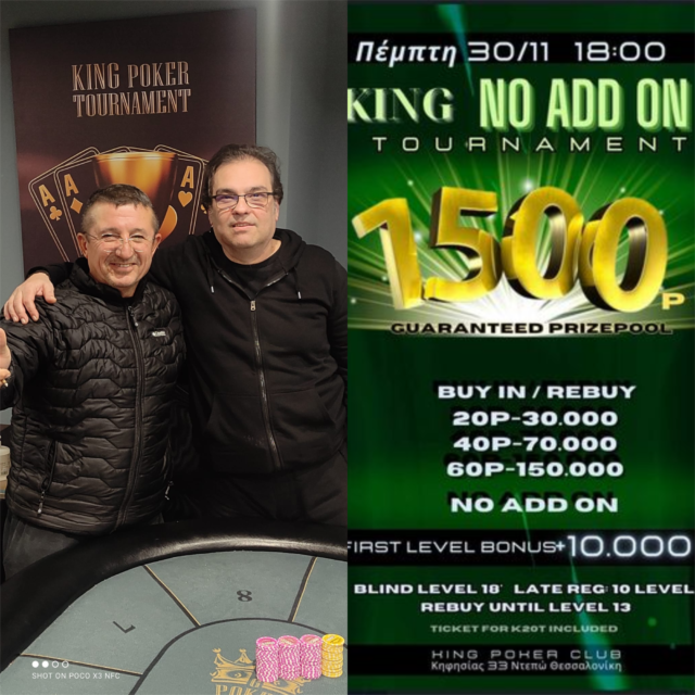 Με το καθιερωμένο πλέον No Addon (τρεις επιλογές για buy-in) στις 18:00 και 1.500p gtd συνεχίζεται απόψε η δράση στο King.