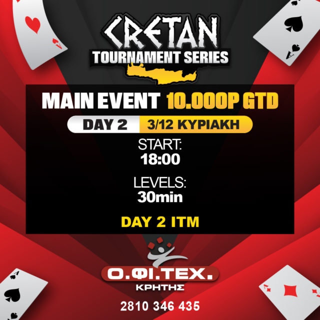 και τη Day 2 του Cretan main event (10.000p gtd) στο Ηράκλειο Κρήτης