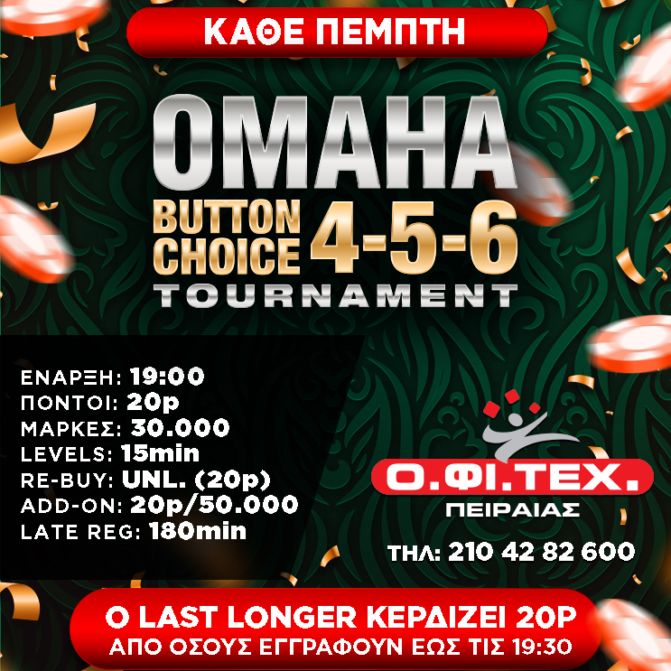 το freeroll (200p gtd) και το Omaha Button Choice 4-5-6 στον Πειραιά