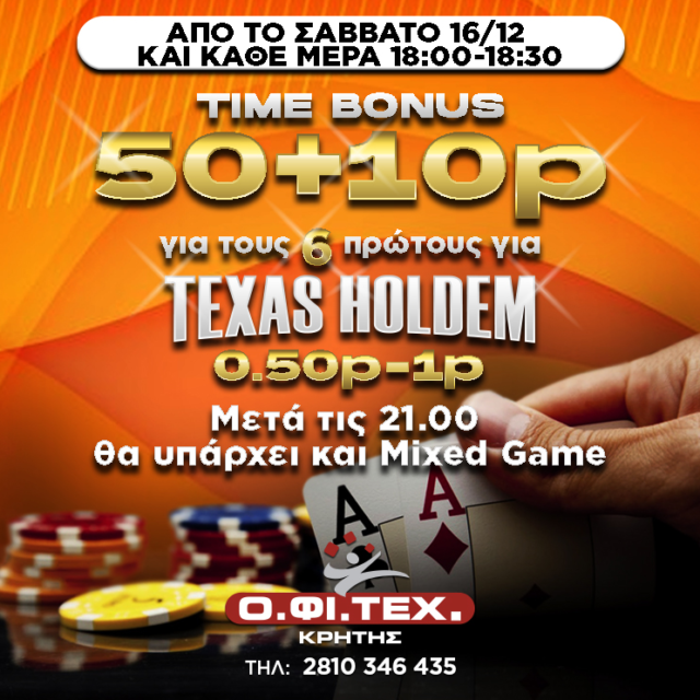 Από τις 18:00 τα 0.5p/1p Texas games με time bonus 50p + 10p τα πρώτα 30 λεπτά