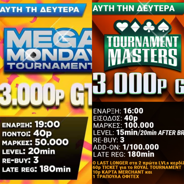 Guarantee 3.000p τόσο στο Mega Monday του Αλίμου όσο και στο Tournament Masters του Αμαρουσίου που ξεκινάει ΣΕ ΝΕΑ ΩΡΑ (16:00) σήμερα και συνοδεύεται από last longer!