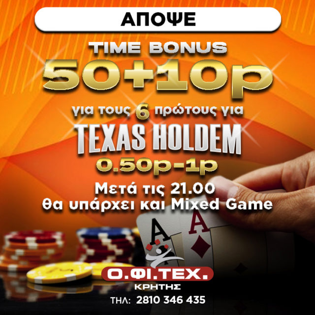Από τις 18:00 τα 0.5p/1p Texas games με time bonus 50p + 10p τα πρώτα 30 λεπτά