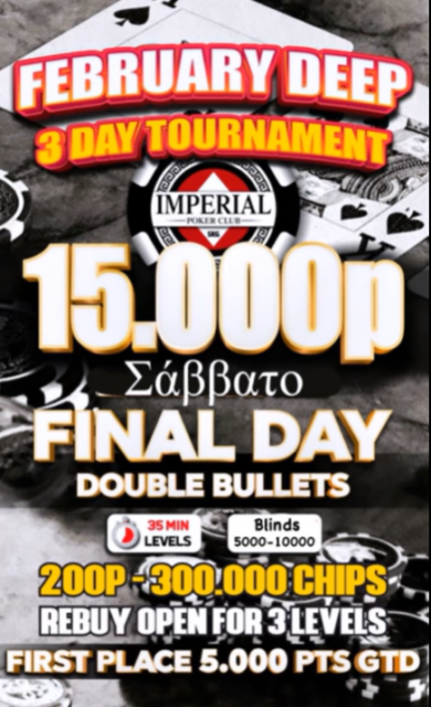 Η final day ξεκινάει στις 18:30 (blinds 5k/10k) με δικαίωμα για double bullets (200p – 300.000) και rebuys τα τρία πρώτα 35λεπτα levels!