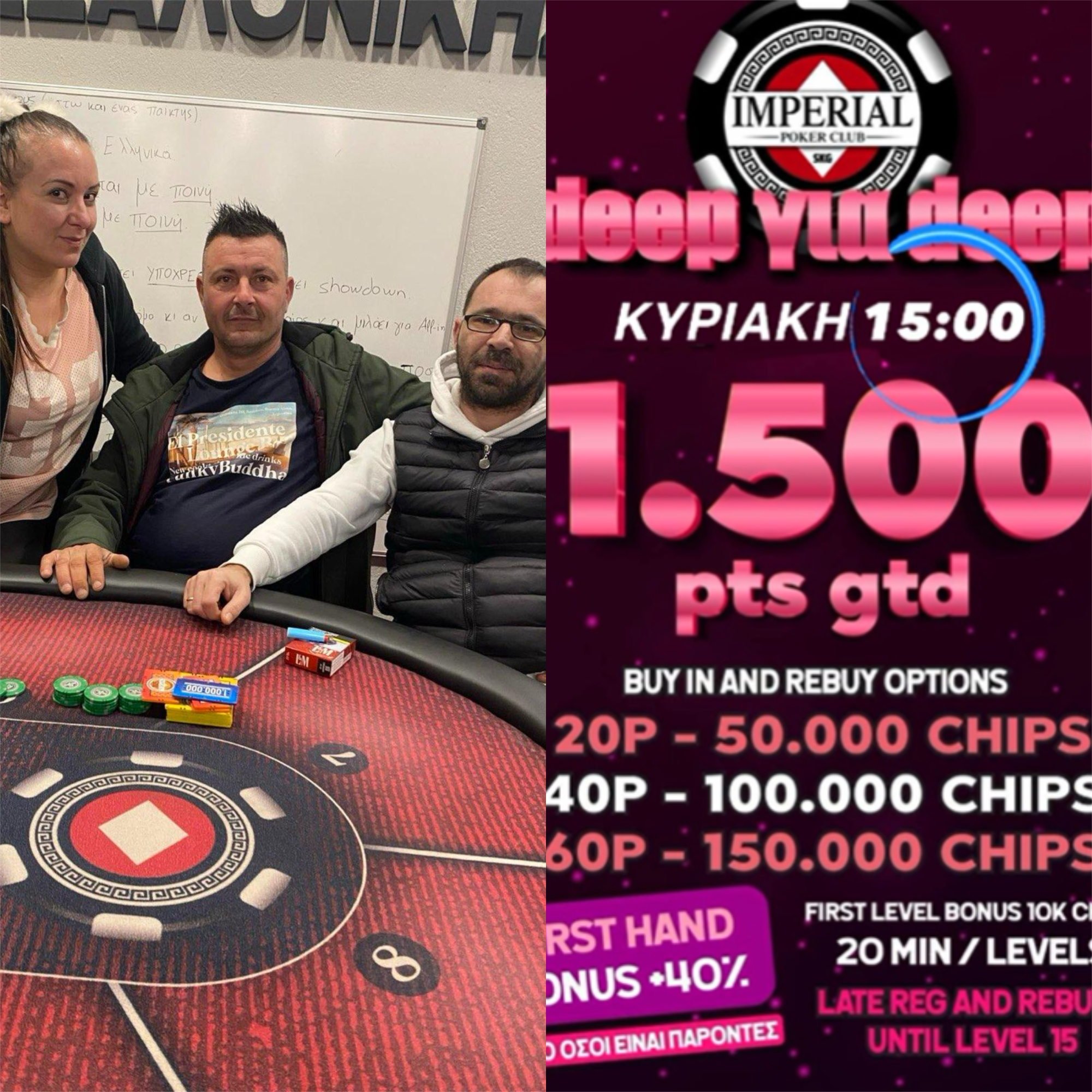 Από νωρίς σήμερα η δράση (15:00) με deepstack παιχνίδι (1.500p gtd) και τρεις επιλογές (20p/40p/60p) για να βουτήξετε στο τουρνουά, ενώ από τις 17:00 θα “τρέχουν” και τα καθιερωμένα 1p/1p Texas/PLO games.