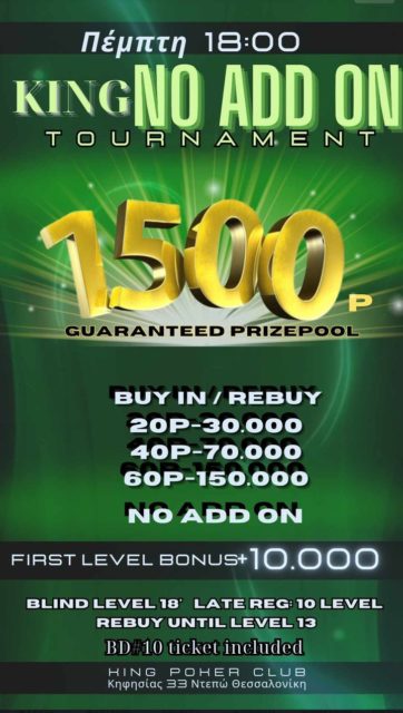 Με το καθιερωμένο No Addon, τρεις επιλογές για buy-in (20p/40p/60p) και 1.500p gtd συνεχίζεται απόψε η δράση στο King!