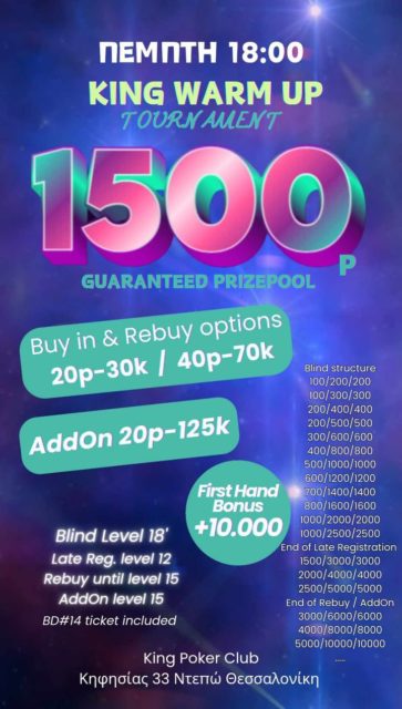 Σήμερα στις 18:00 σας περιμένει το King Warm-Up με δύο επιλογές (20p/40p) να εισέλθετε στο τουρνουά, 18λεπτα levels και 1.500p gtd!