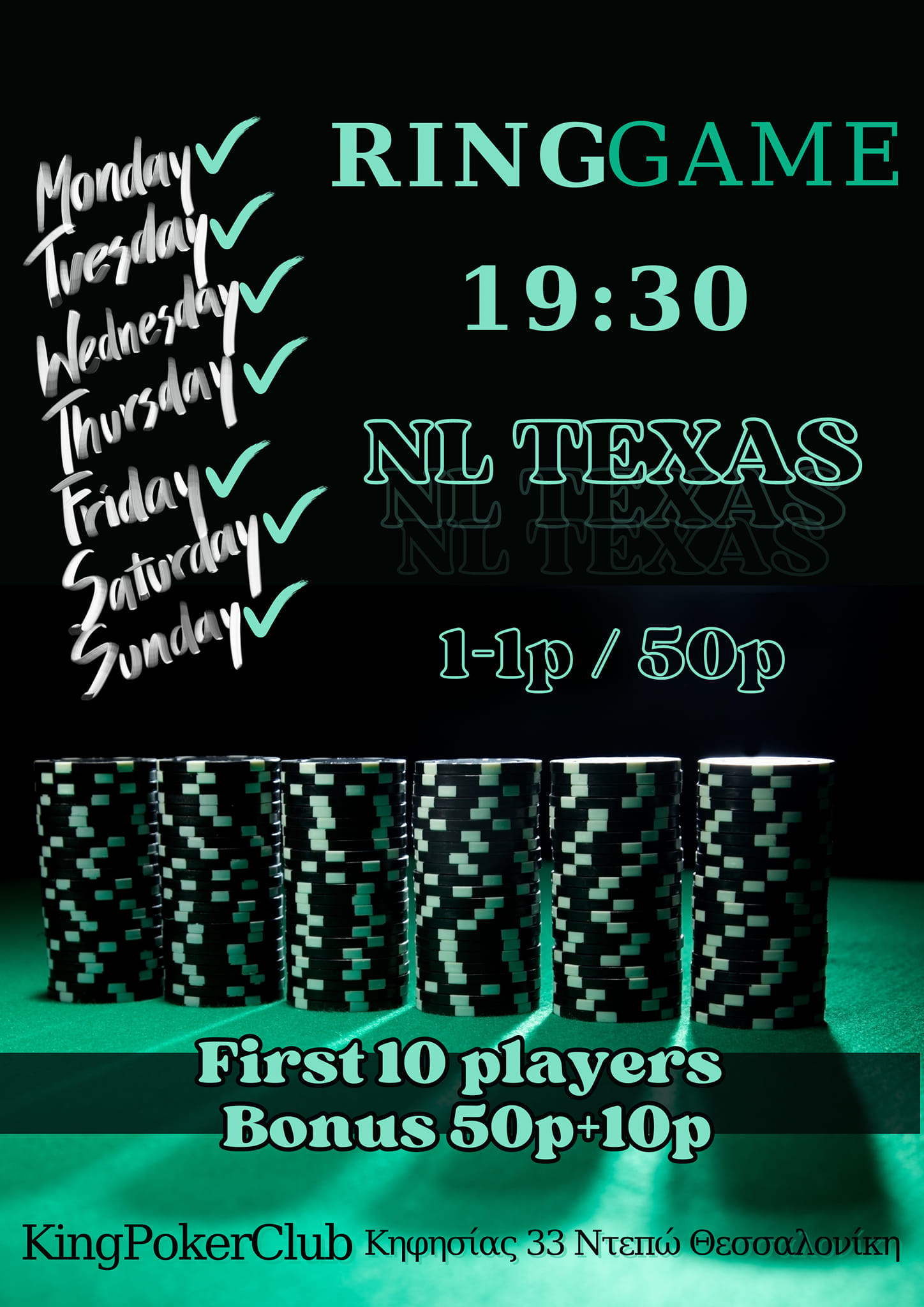 Η Κυριακή όπως πάντα θα τρέξει αποκλειστικά με ring games και 1p/2p mix games από τις 20:30, ενώ από την Δευτέρα καθιερώνονται κάθε μέρα Texas games με bonus 50p + 10p για τους πρώτους δέκα παίκτες!
