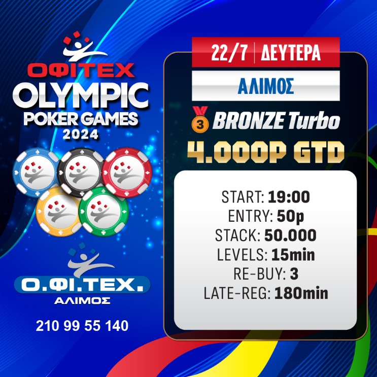 + tournament ticket 30p για τις θέσεις 1 και bubble (για τα satellites του Olympic Poker Games).