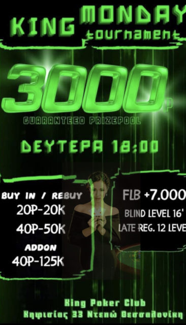 To καθιερωμένο King Monday επιστρέφει στις 18:00 με 16λεπτα levels και τουλάχιστον 3.000p για τους παίκτες!