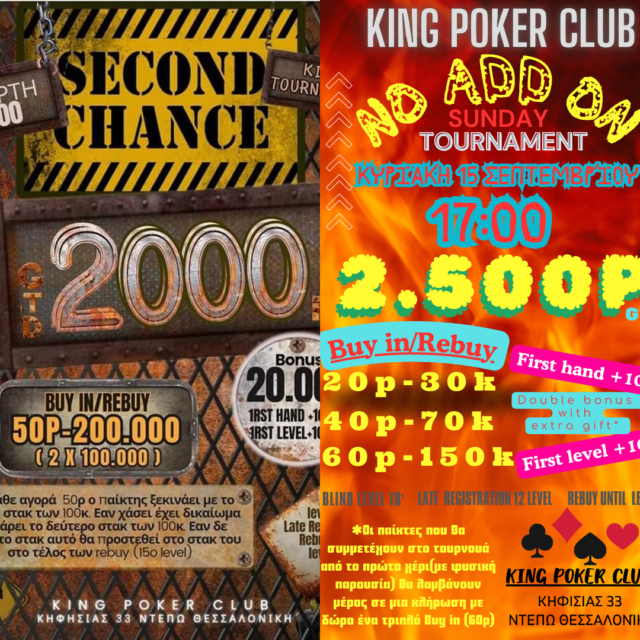 Το Second Chance επιστρέφει στις 18:00 στο King με διπλό stack (200.000), διπλό bonus (20.000) και 2.000p gtd, ενώ ανακοινώθηκε κι ένα νέο κυριακάτικο τουρνουά!