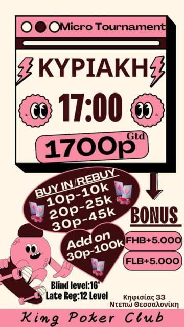 Mε τρεις επιλογές για buy-in/rebuy, 16λεπτα levels και τουλάχιστον 1.700p για τους παίκτες θα λάβει χώρα το κυριακάτικο Micro.