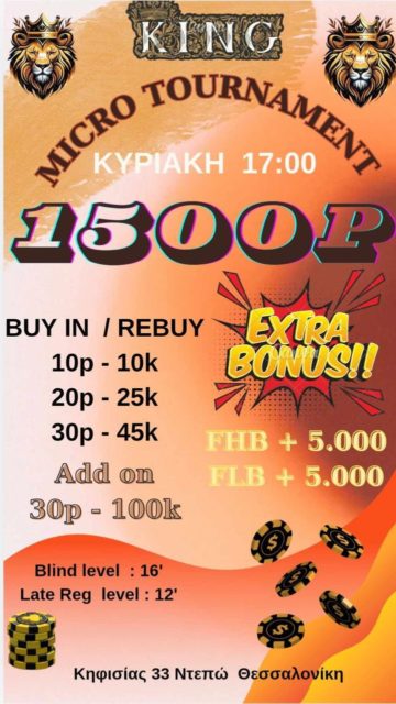 Mε τρεις επιλογές για buy-in/rebuy, 16λεπτα levels και τουλάχιστον 1.500p για τους παίκτες θα λάβει χώρα το κυριακάτικο Micro.