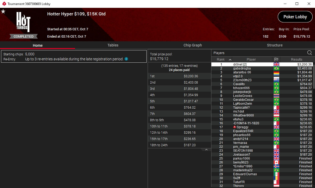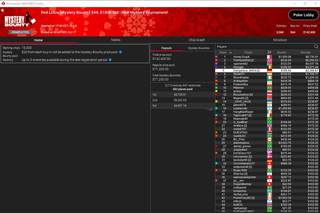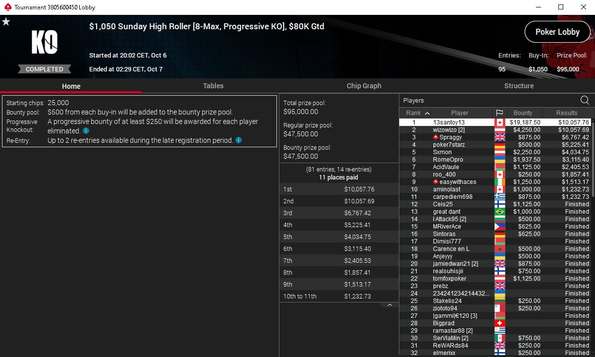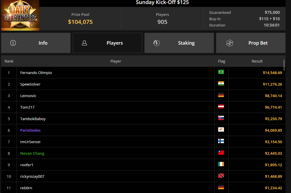 Στην 11η θέση του $1k Sunday PKO τερμάτισε εξάλλου ο “carpediem698” κερδίζοντας $2.108.