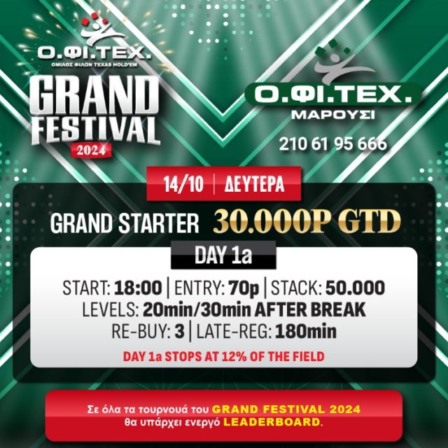 To μεγάλο φθινοπωρινό φεστιβάλ ξεκινάει απόψε με πρώτη στάση στο Μαρούσι για τη Day 1a του Grand Starter (30.000p gtd). To πρώτο hand θα μοιραστεί στις 18:00 και το… τελευταίο μόλις απομείνει το 12% του field.
