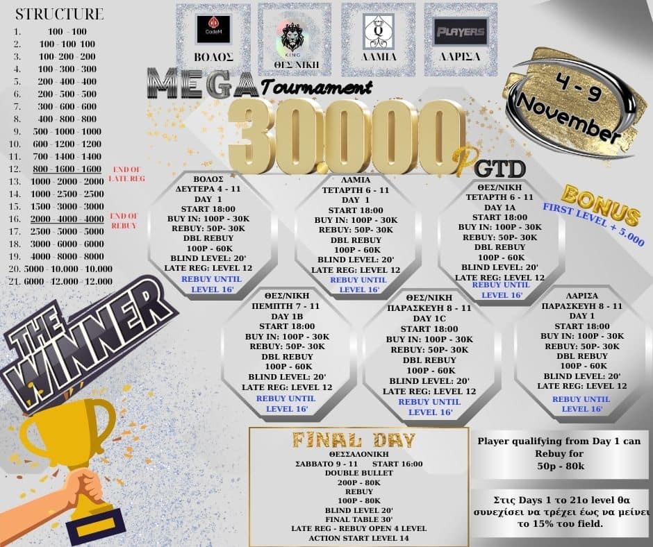 - Ισχύει προκράτηση θέσεων με κατοχύρωση του bonus του 1ου level με την εξής διάφορα. Σε περίπτωση που δεν προσέλθει ο παίκτης μέχρι το τέλος του 3ου level (1 ώρα παιχνιδιού) το bonus θα αφαιρείται από το stack του.