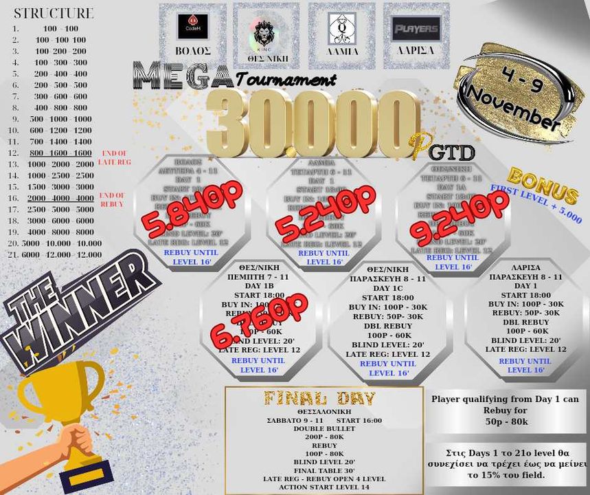 Δικαίωμα για καθυστερημένες εγγραφές στα πρώτα 12 levels και απεριόριστα rebuys (50p – 30.000) μέχρι το Level 16