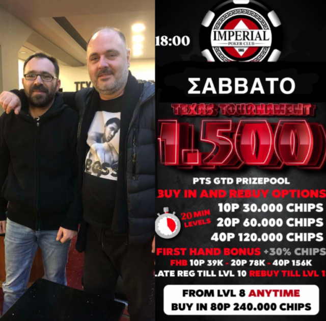 Σήμερα στις 18:00 θα διεξαχθεί ένα τουρνουά Texas με τρεις επιλογές για buy-in/rebuy (10p/20p/40p) και 1.500p gtd!