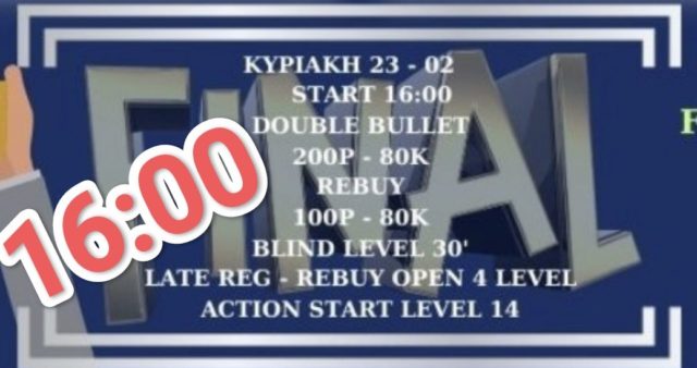 Η δράση σήμερα ξεκινάει στις 16:00 (blinds 1k/2.5k) και για 4 levels των 30 λεπτών οι παίκτες θα έχουν δικαίωμα για double bullet (200p – 80.000) και rebuys.