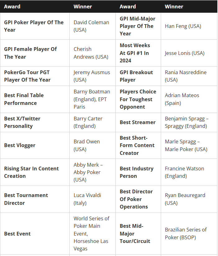 Ο Han Feng κέρδισε τον τίτλο του Παίκτη της Χρονιάς στην κατηγορία Mid-Major, ενώ ο Jeremy Ausmus στέφθηκε Παίκτης της Χρονιάς για το PGT, με δύο πρωτιές και $6.491.016 σε κέρδη!