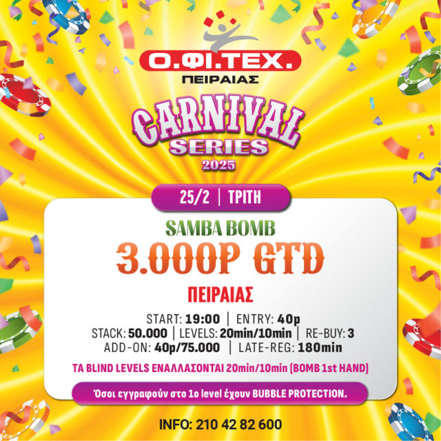 Ανέβασε τους ρυθμούς στο Samba Bomb, όπου τα blind levels εναλλάσσονται κάθε 10 λεπτά, και το 1ο χέρι κάθε level είναι ένα… Bomb Pot!