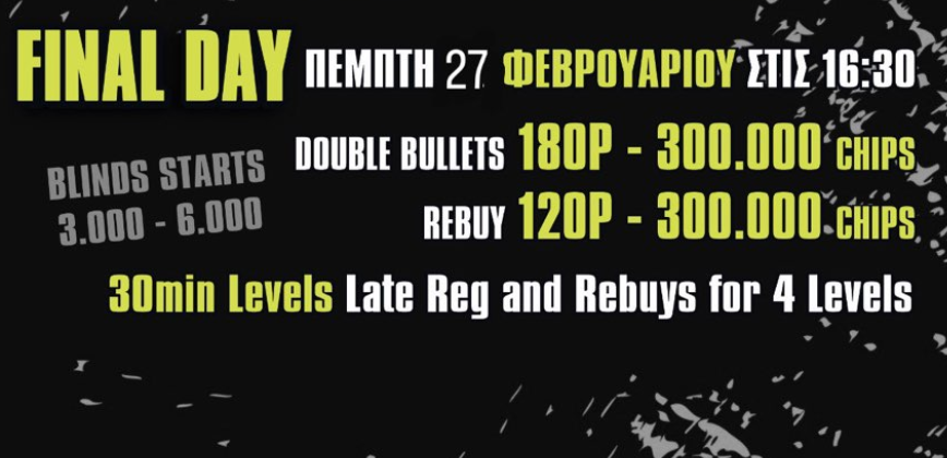 Δικαίωμα για double bullet με 180p (300.000) και απεριόριστα rebuys με 120p (300.000) τα πρώτα 4 levels