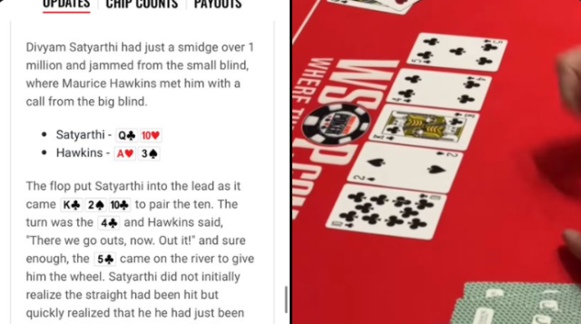δίνοντας flush στον Satyarthi, αλλά dealers και παίκτες δεν τον αντιλήφθηκαν θεωρώντας ότι το straight του Hawkins στο river είναι αυτό που κερδίζει!