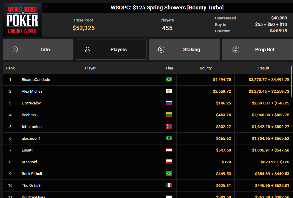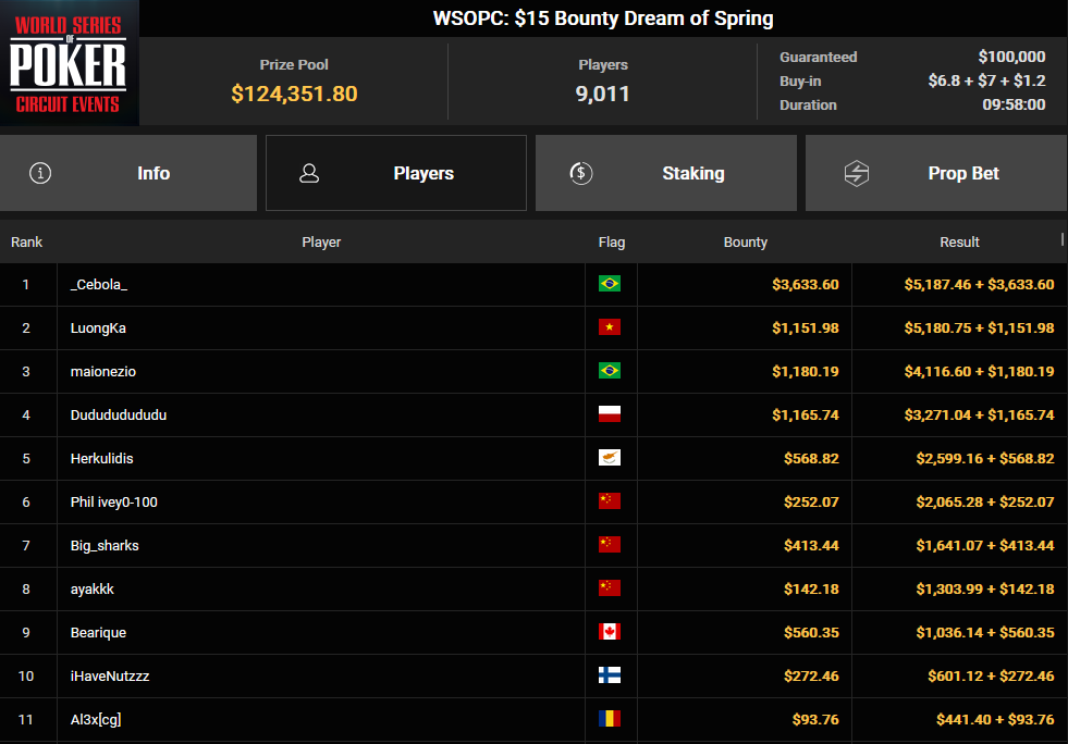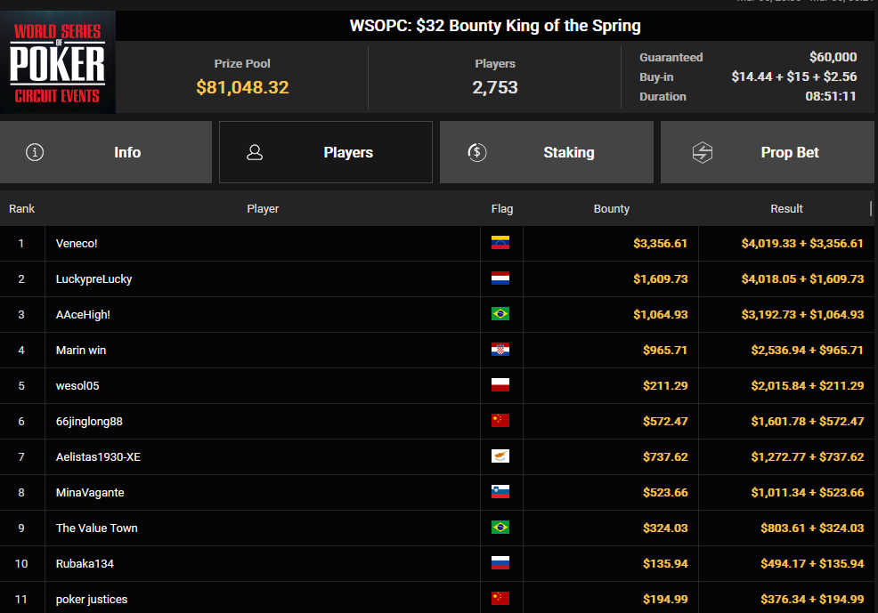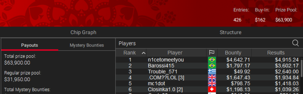 Στην 7η θέση του $32 Βοunty King αποκλείστηκε τέλος ο “Aelistas1930-XE” εξασφαλίζοντας $2.011.
