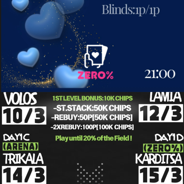 Επικές μάχες στα 1p/1p Texas games αναμένονται ακόμη ένα σαββατόβραδο στο Zero % της Καρδίτσας, με τα πρώτα φύλλα στον αέρα να είναι στις 21:00.