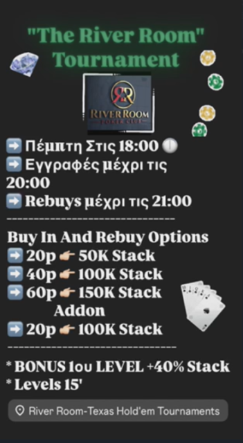 Ο σύλλογος ‘River room poker club’ εδρεύει στην οδό Γρηγοροπούλου 1, δίπλα στα Υπεραστικά Kεντρικά ΚΤΕΛ της Λάρισας.