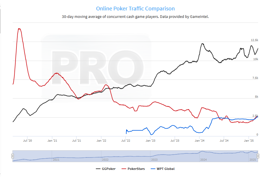 Για πολλά χρόνια η PokerStars ήταν η κυρίαρχη δύναμη στο διαδικτυακό πόκερ. Ωστόσο, ο αυξανόμενος ανταγωνισμός και η αποχώρηση από πολλές χώρες την έχουν οδηγήσει να χάσει τη θέση της ως η μεγαλύτερη διαδικτυακή αίθουσα πόκερ στον κόσμο. Σήμερα, βρίσκεται στην τρίτη θέση, πίσω από τη GGPoker και το WPT Global.