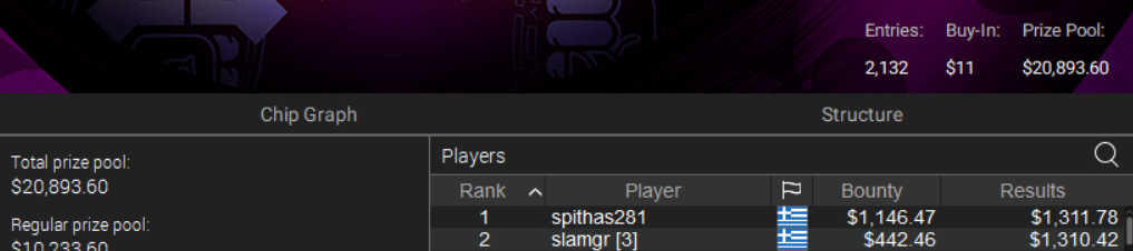 Ελληνικό heads-up στο $11 Bounty Builder με $2.458 για τον “spithas281” και $1.753 για τον “slamgr”.